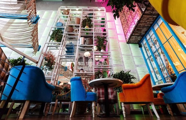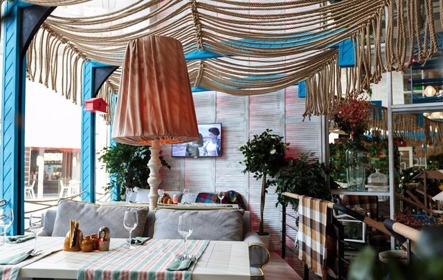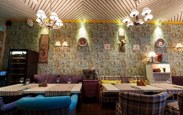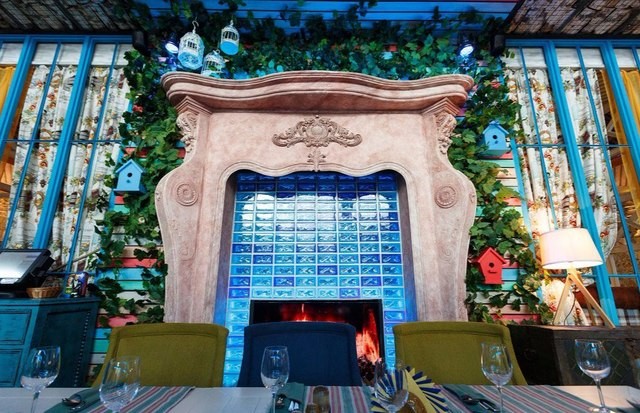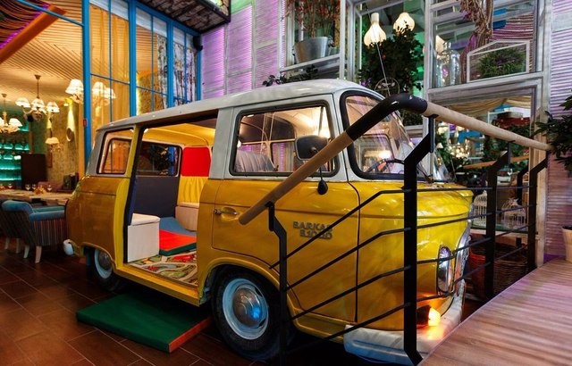 Современный, яркий интерьер погружает гостей в пространство уютного, обжитого дома, где в каждом уголке можно найти что-то интересное. Фотографии в рамках, велосипед, увитый плющом, камин с неоновой подсветкой, клетки птиц под потолком и детская зона в виде автобуса. Все это позволяет гостям окончательно расслабиться и получить удовольствие от встречи.